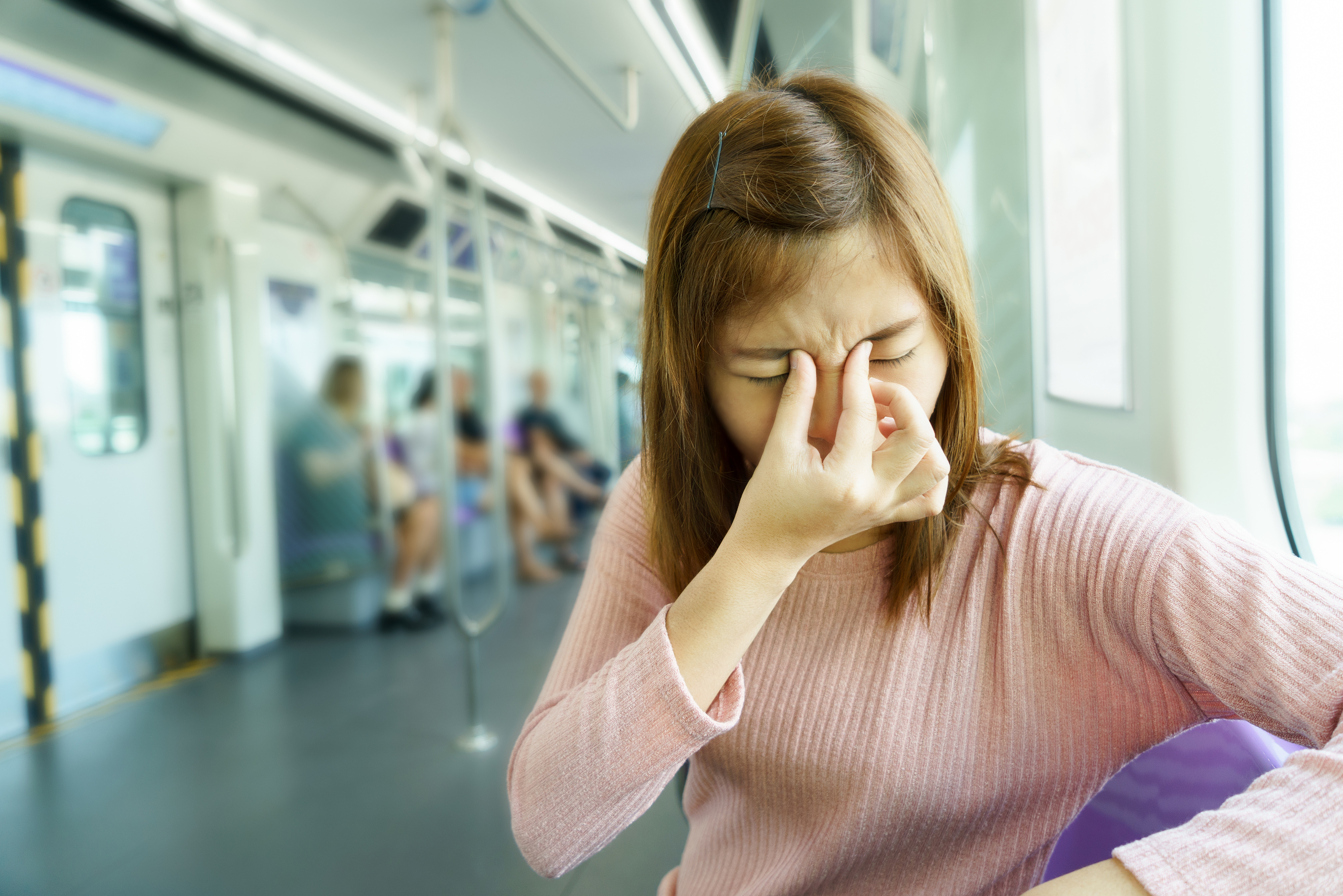 Portrait of young woman eye pain while taking the sky train